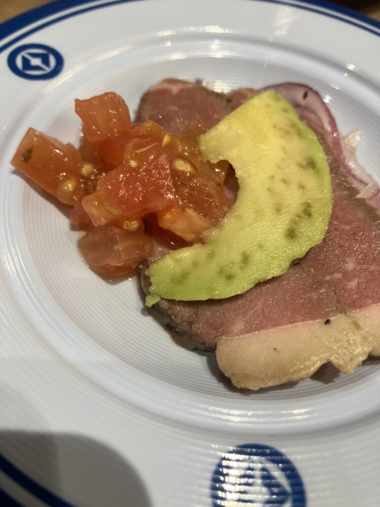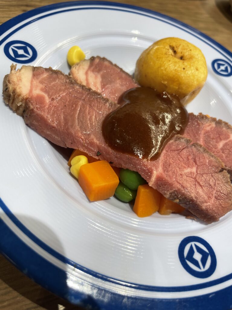 ローストビーフやチキン、ポークなどの肉に、カリッと焼いたじゃがいも・人参・ブロッコリーなどを添えるのが定番らしい