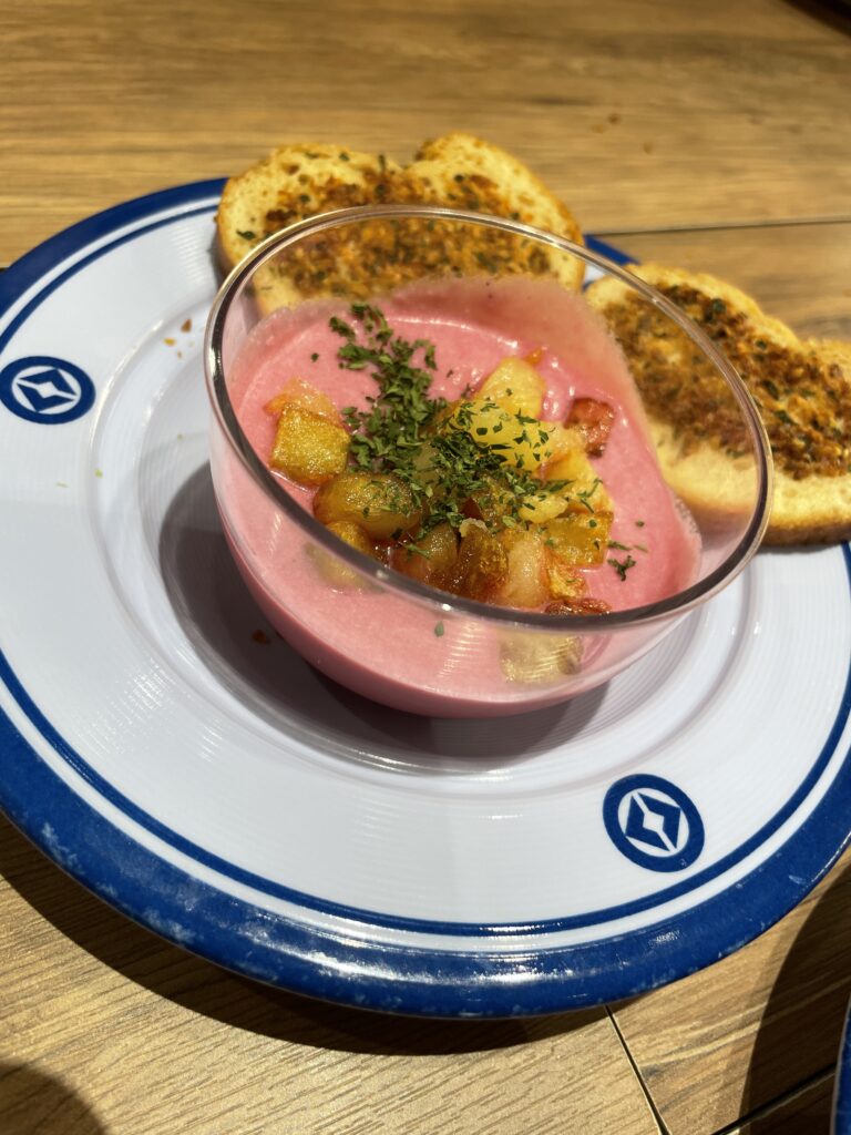 エンサラダ・デ・フェリア(Ensalada de Feria)」は、パナマの伝統的なサラダ料理のひとつで、ポテト(じゃがいも)とビーツを主な材料に、マヨネーズなどのクリーミーなドレッシングで和えた一品らしい
