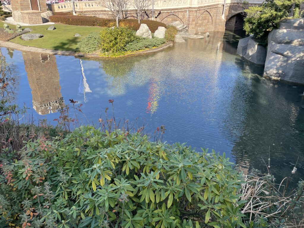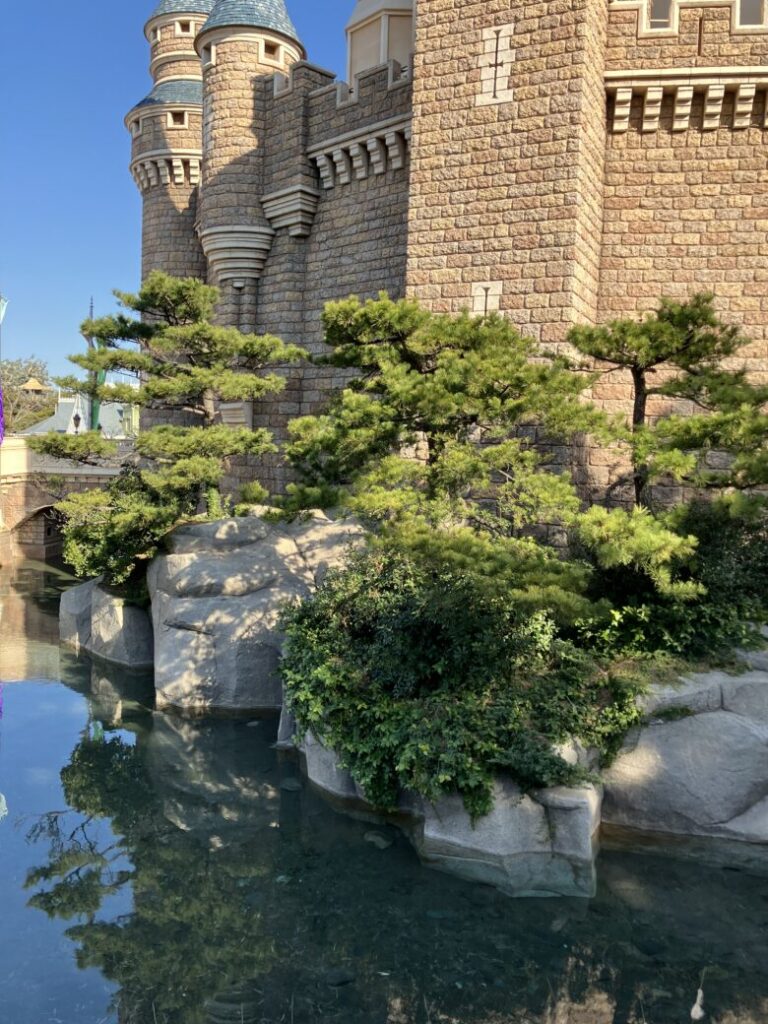 石垣と岩組み(景石): お城の土台となっている石垣と、水際にある大きな岩の組み合わせは、日本の城郭の石垣や、日本庭園の「岩組み」の手法を彷彿とさせます。