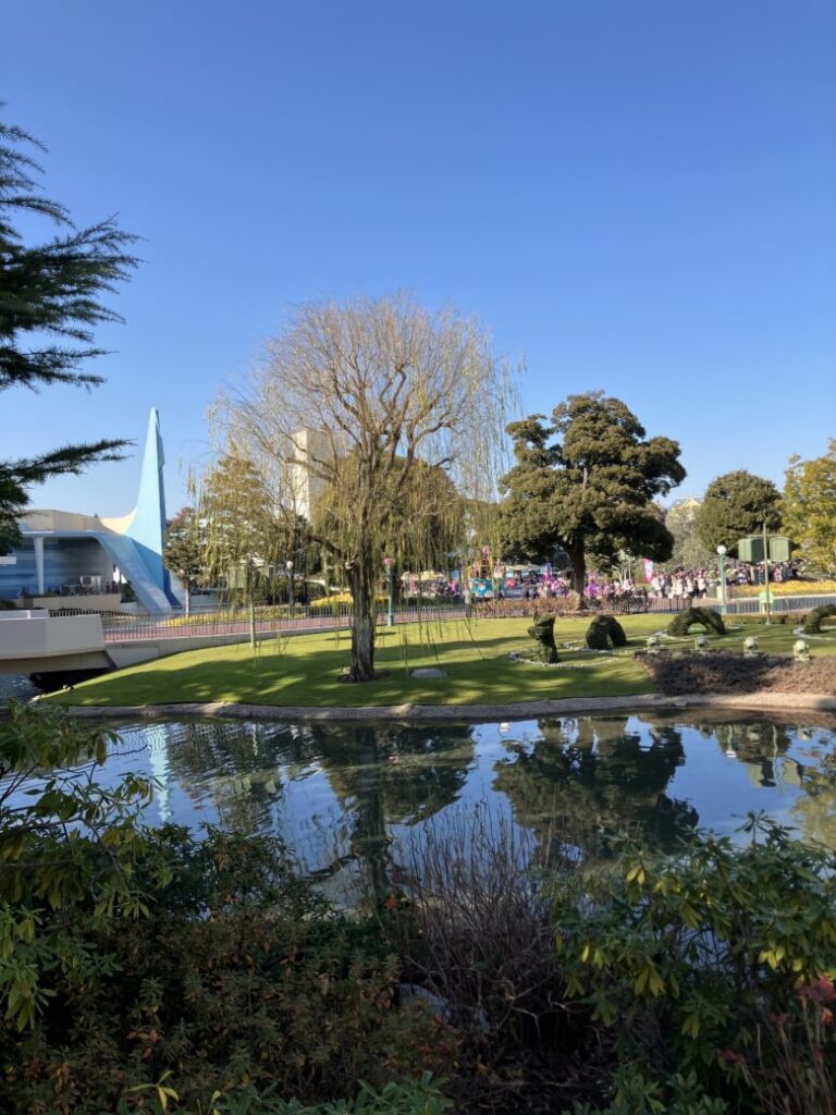 - 景石(けいせき)と石組み: 中央の島にある白い大きな岩の配置は、まさに日本庭園の「石組み」そのものです。西洋では左右対称に置くことが多いですが、ここではあえてランダムに、かつバランス良く配置して自然の山水を表現しています。