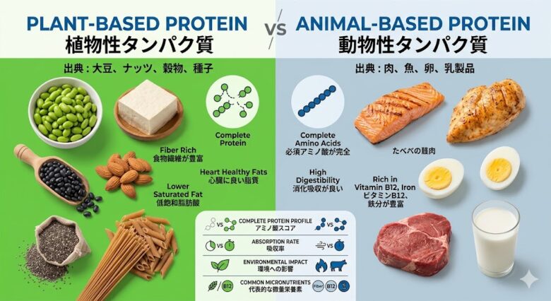ただし、同じ条件で比べると、動物性タンパクのほうがやや有利になりやすい、というのが現在のエビデンスに近い理解です。